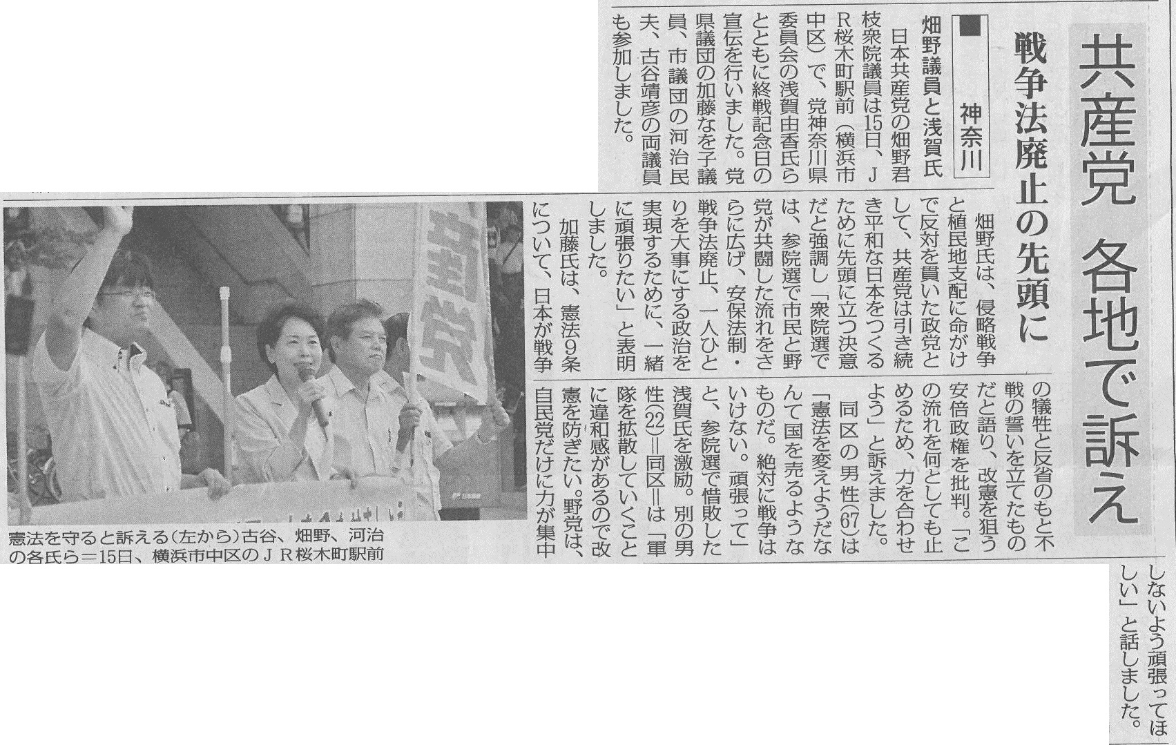 1958年から始まって以後、核兵器廃絶をかかげる平和行進は、かかさずおこなわれ、毎年十万人あまりが参加する大きな国民的な運動。この草の根からのとりくみは、核保有国までもが核兵器廃絶の「明確な約束」をせざるをえないところまで国際世論を動かしてきました。日本でも全国の地方自治体の77%が非核平和宣言をおこない、非核三原則が国是となっているのも、こうした国民的な運動の成果です。しかしながら、ここ横浜市は非核平和都市宣言を行なっておりません。市議会の中で、1970年と1984年に二度、非核平和都市宣言をするべきだという決議を行いましたが、歴代の市長は行おうとしませんでした。現林市政でもこの問題は、全く変わりません。平和を願う市民の声を集めて市政も動かしていきたいと思います。